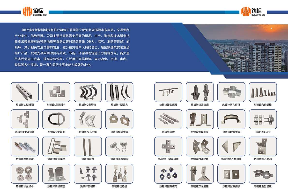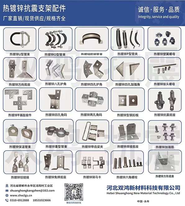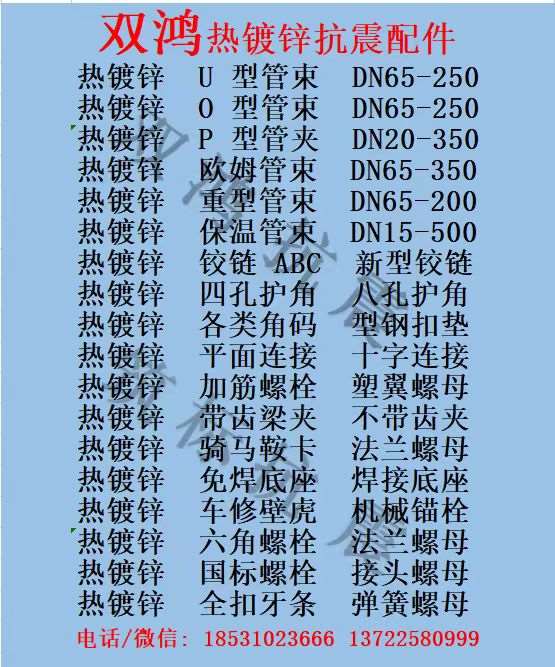 主营:热镀锌抗震配件、热镀锌U型管束DN65-250、热镀锌O型管束DN65-250 热镀锌P型管夹DN20-350、热镀锌欧姆管束DN65-350、热镀锌重型管束DN65-200、铰链ABC、各类护角、各类角码、平面连接、V型加筋、塑翼螺母、型钢扣垫、带齿梁夹、骑马鞍卡、免焊底座、焊接底座、车修壁虎、六角螺栓、接头螺母、保温管束、法兰螺母