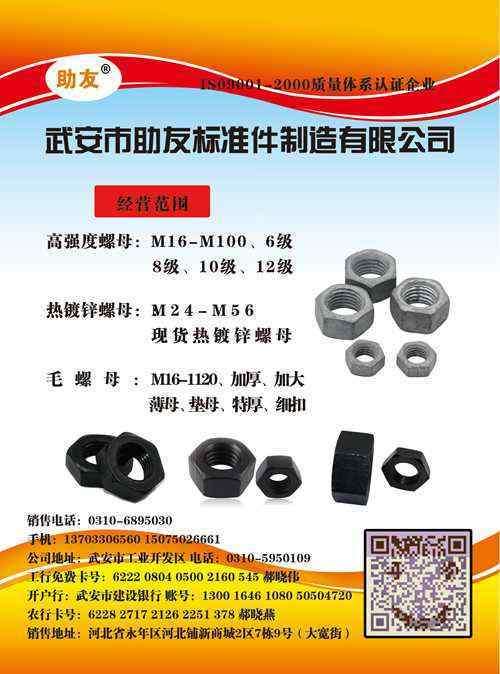 主营:高强度螺母:M6-M100、6级、8级、10级、12级 热镀锌螺母:M24-M56、现货热镀锌螺母 毛螺母:M16-M120 加厚、加大、薄母、垫母、特厚、细扣