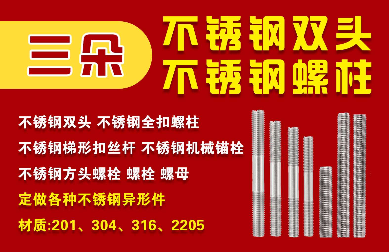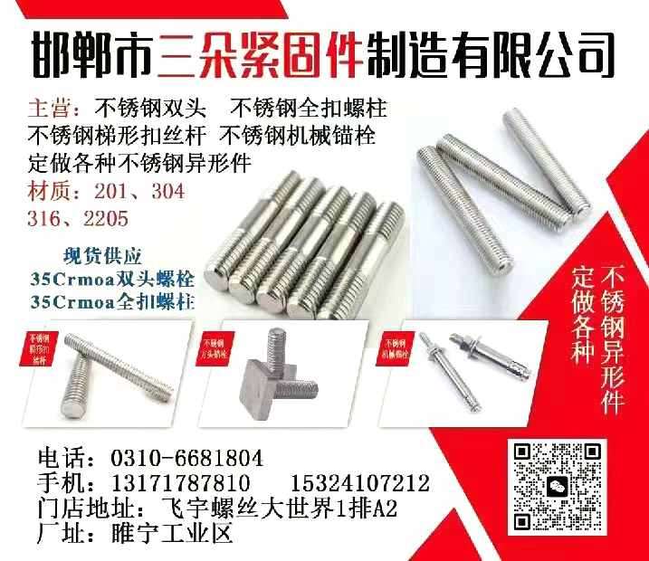 主营:不锈钢双头 不锈钢全扣螺柱 不锈钢梯形扣丝杆 不锈钢机械锚栓 不锈钢方头螺栓 螺栓 螺母 定做各种不锈钢异形件材质: 201、304、316、2205。