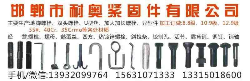 主营:生产:地脚螺栓、双头螺栓,U型丝、加大加长螺栓、异型件加工订做:8.8级、10.9级、12.9级、35#、40Cr. 35Crmo等各处材质 经营:螺栓、螺母、鹅蛋丝、四方螺栓、斗型丝、T型螺栓、沉头单耳、沉头内六角螺栓、热镀锌螺栓、铰制孔、活节、靠背销、铆钉、销轴