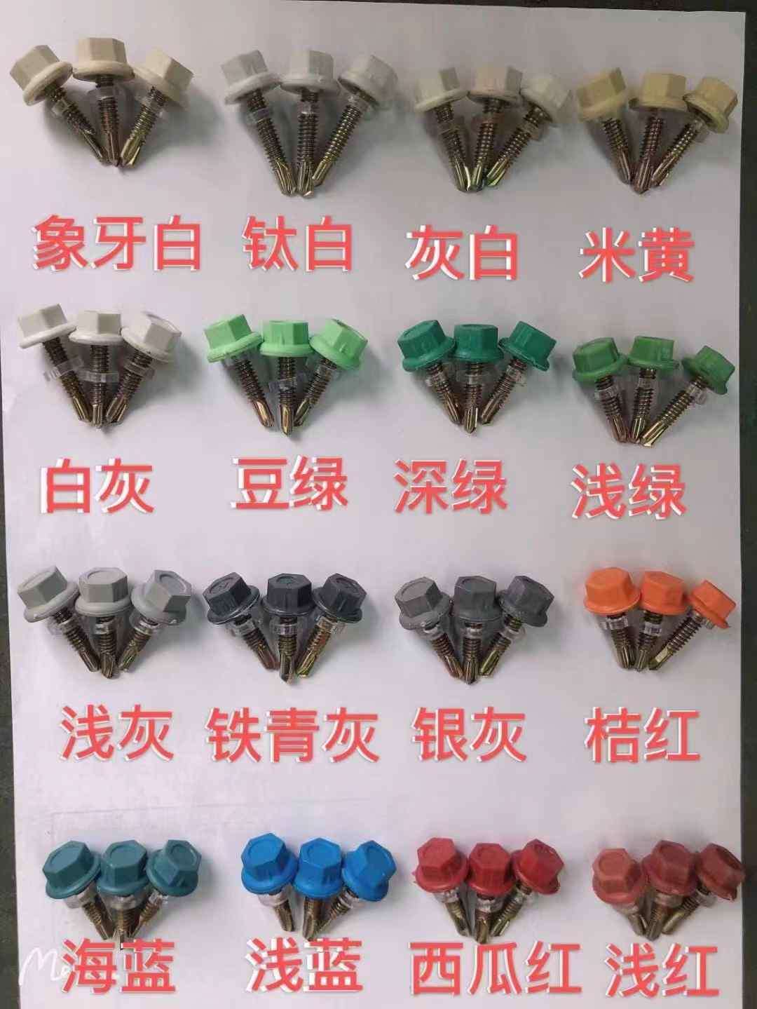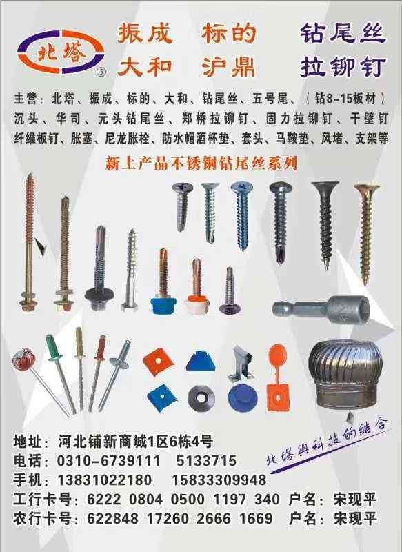 主营:北塔、振成、标的、大和、钻尾丝、五号尾、(钻8-15板材)沉头、华司、元头钻尾丝、郑桥拉铆钉、固力拉铆钉、干壁钉、纤维板钉、胀塞、尼龙胀栓、防水帽酒杯垫、套头、马鞍垫、风堵、支架等 新上产品不锈钢钻尾丝系列