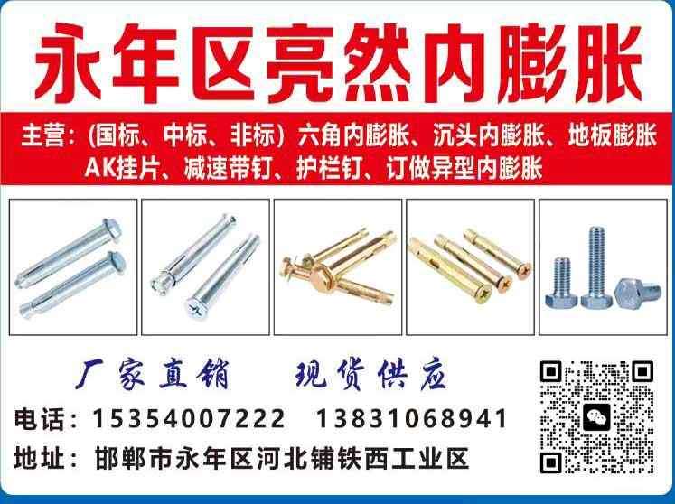 主营:(国标、中标、非标)六角内膨胀、沉头内膨胀、5地板膨胀、AK 挂片、30 栓、减速带钉、护栏钉、订做异型内膨胀