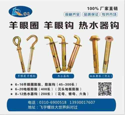主营:羊眼圈 羊眼钩 热水器钩 ★6-16羊眼圈膨胀、膨胀钩(45-300长) ★6-20地板膨胀(400长)(沉头地板膨胀) ★8-12热水器钩(200长)(花母、锥母、六角)