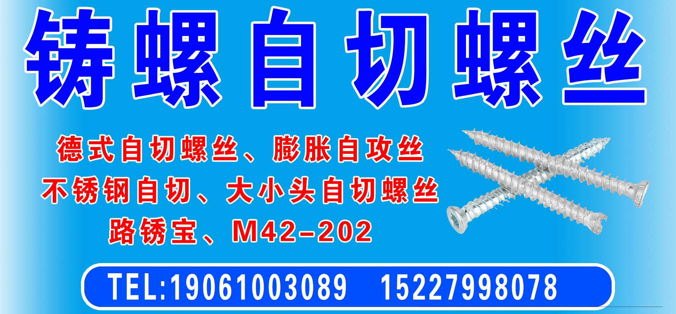 主营:德式自切螺丝,门窗自切螺丝,膨胀自攻丝,不锈钢自切,大小头自切螺丝、路锈宝,M42-202