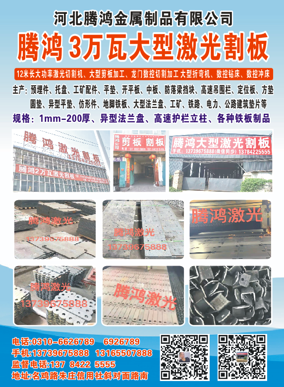 主营:主产:预埋件、托盘、工矿配件、平垫、开平板、中板、防落梁挡块、高速吊围栏、定位板、方垫,圆垫、异型平垫、仿形件、地脚铁板、大型法兰盘、工矿、铁路、电力、公路建筑垫片等,规格:1mm-200厚、异型法兰盘、高速护栏立柱、各种铁板制品,12米长大功率激光切割机、大型剪板加工、龙门数控切割加工 大型折弯机、数控钻床、数控冲床