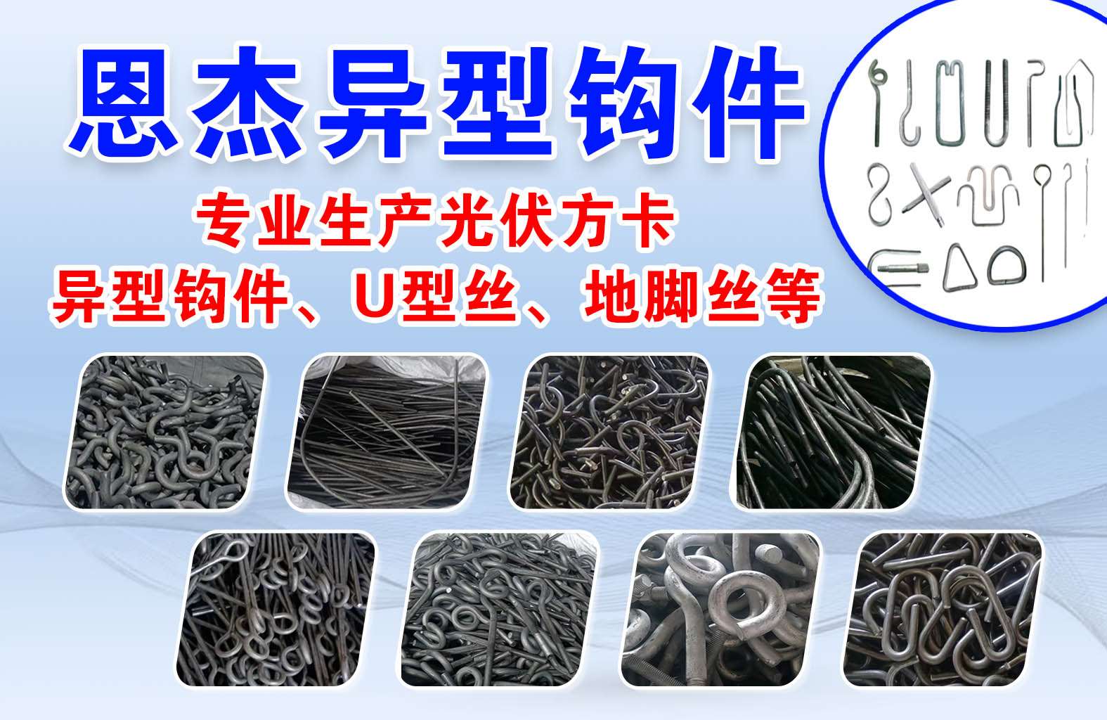 主营:专业生产光伏方卡、异型钩件、U型丝、地脚丝等