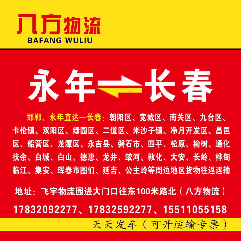 直达城市:长春:朝阳区、宽城区、南关区、九台区、卡伦镇、双阳区、绿园区、二道区、米沙子镇、净月开发区、昌邑区、船营区、龙潭区、永吉县、磐石市、四平、松原、榆树、通化、扶余、白城、白山、德惠、龙井、蛟河、敦化、大安、长岭、桦甸、临江、集安、珲春市图们、延吉、公主岭等周边地区货物往返运输,覆盖东北三省,点发全国、各大市场均可送货 覆盖东北三省,点发全国