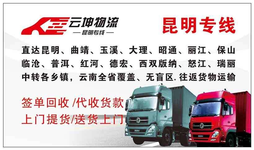 直达城市:直达昆明、曲靖、玉溪、大理、昭通、丽江、保山、临沧、普洱、红河、德宏、西双版纳、怒江、瑞丽、楚雄、文山、迪庆、石林、中转各乡镇 云南全省覆盖,无盲区 往返货物运输