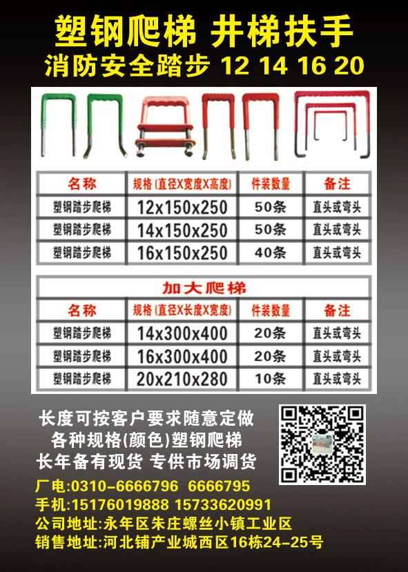 主营:塑钢爬梯 井梯扶手 铸铁爬梯 消防安全踏步 12 14 16 20 长度可按客户要求随意定做各种规格(颜色)塑钢爬梯