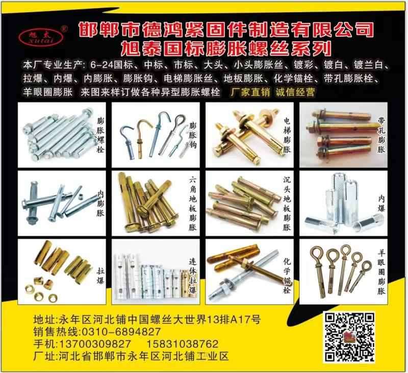 主营:6-24国标大头、小头膨胀丝、镀彩镀白、镀蓝白、拉爆、内爆、内膨胀膨胀钩、电梯膨胀栓、化学锚栓、带孔膨胀、订做各种异型膨胀栓