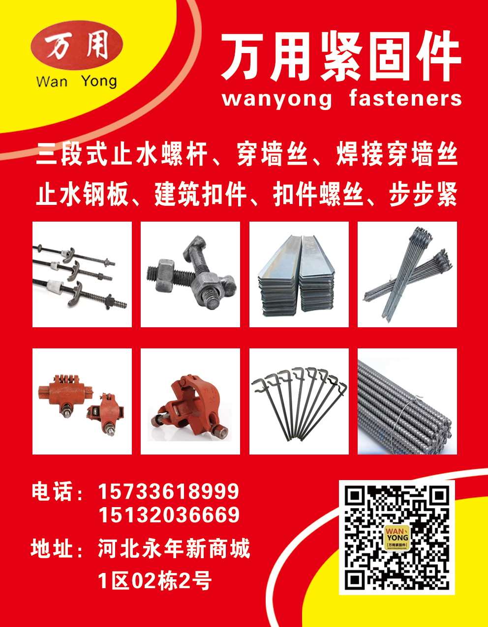 主营:三段式止水螺杆、穿墙丝、焊接穿墙丝、止水钢板、建筑扣件 扣件螺丝、步步紧等各种建筑配件、专供市场调货