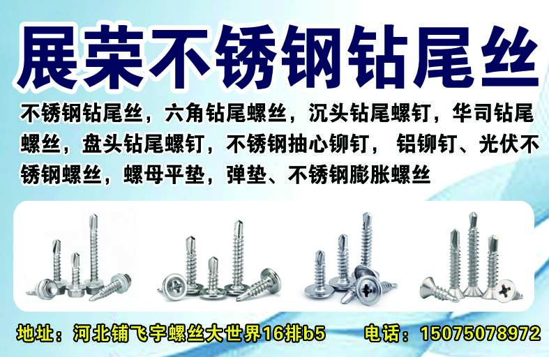 主营:主营:不锈钢钻尾丝,六角钻尾螺丝,沉头钻尾螺钉,华司钻尾螺丝,盘头钻尾螺钉,不锈钢抽心铆钉, 铝铆钉、光伏不锈钢螺丝,螺母,平垫,弹垫,不锈钢膨胀螺丝