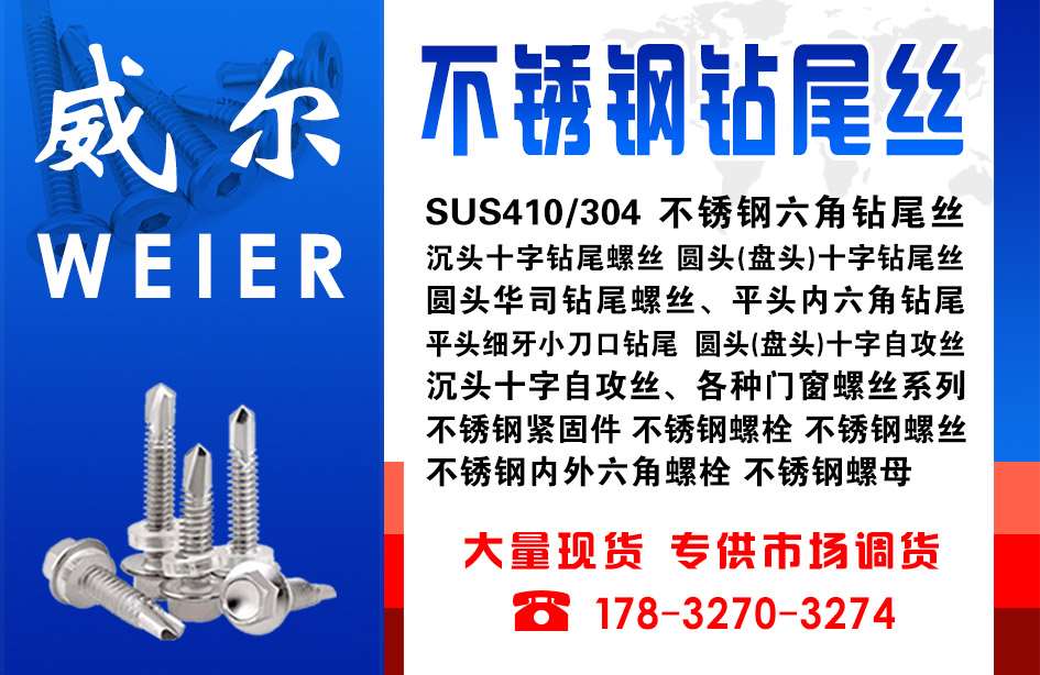 主营:SUS410、/304不锈钢六角钻尾螺丝、沉头十字钻尾螺丝、圆头(盘头)十字钻尾螺丝、圆头华司钻尾螺丝、平头内六角钻尾、平头细牙小刀口钻尾、另有圆头(盘头)十字自攻丝、沉头十字自攻丝、各种门窗螺丝系列。不锈钢紧固件、不锈钢螺栓、不锈钢螺丝、不锈钢内六角螺栓、不锈钢外六角螺栓,不锈钢螺母