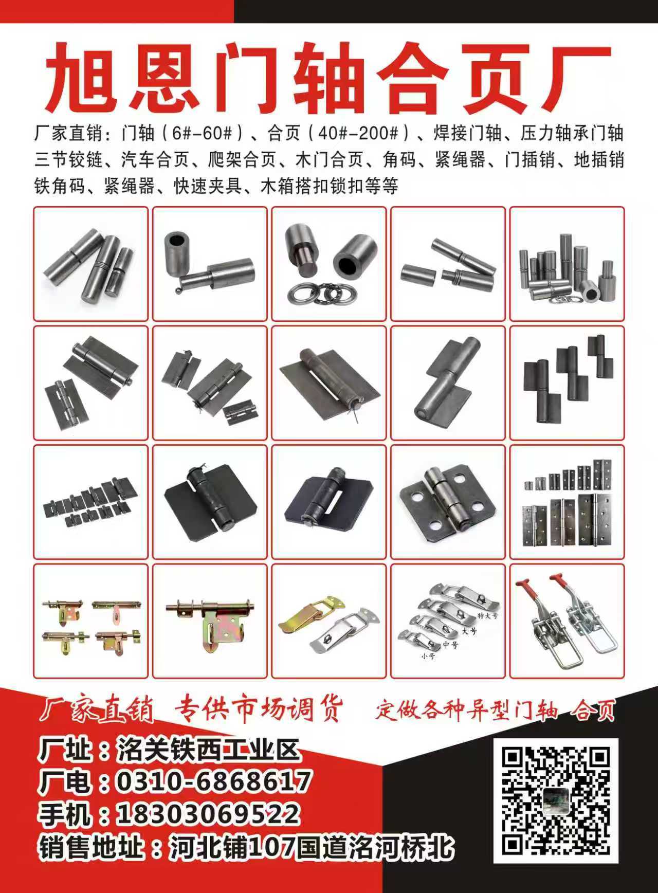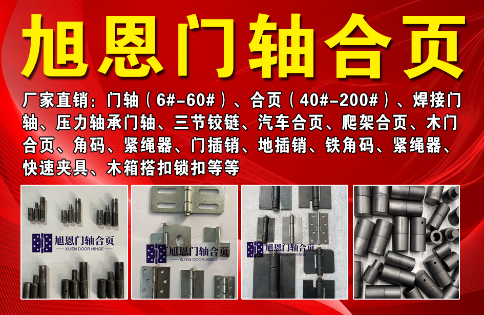 主营:厂家直销:门轴(6#-60#)、合页(40#-200#)、焊接门轴、压力轴承门轴、三节铰链、汽车合页、爬架合页、木门合页、角码、紧绳器、门插销、地插销、铁角码、紧绳器、快速夹具、木箱、搭扣锁扣等等