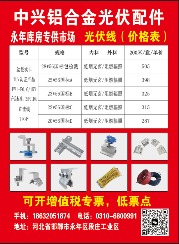 主营:辐照阻燃光伏线,铝合金压块,角齿夹具,梯形夹具,不锈钢螺栓,导电片,塑翼螺帽,及其他配套光伏辅材。