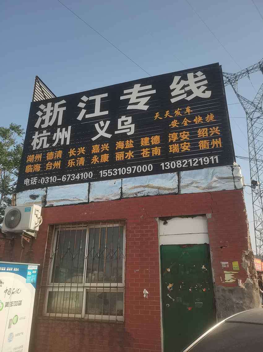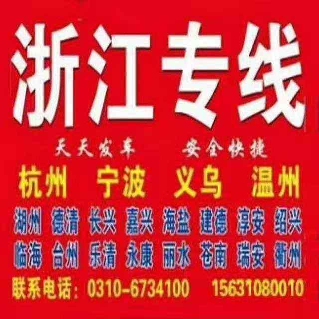 【新商城】浙江全境(通发物流) 浙江全线 永年直达――杭州专线 温州专线 义乌专线 天天发车,信誉第一,客户至上到达:宁波,嘉兴,绍兴,湖州,长兴,德清, 台州,临海,仙居,金华,永康,丽水, 乐清,瑞安,苍南, 淳安,建德,千岛湖以上可送货到:市,区,县, 镇,工业区,联系电话:0310-6734100 手机:13472008166 15631080010 地址:新商城东南角浙江专线(地磅南面)