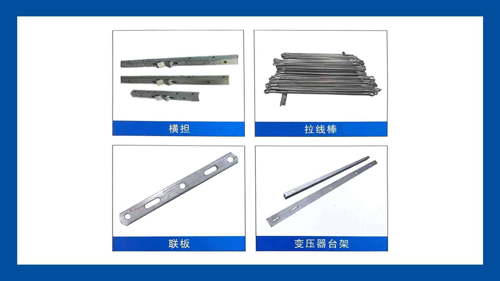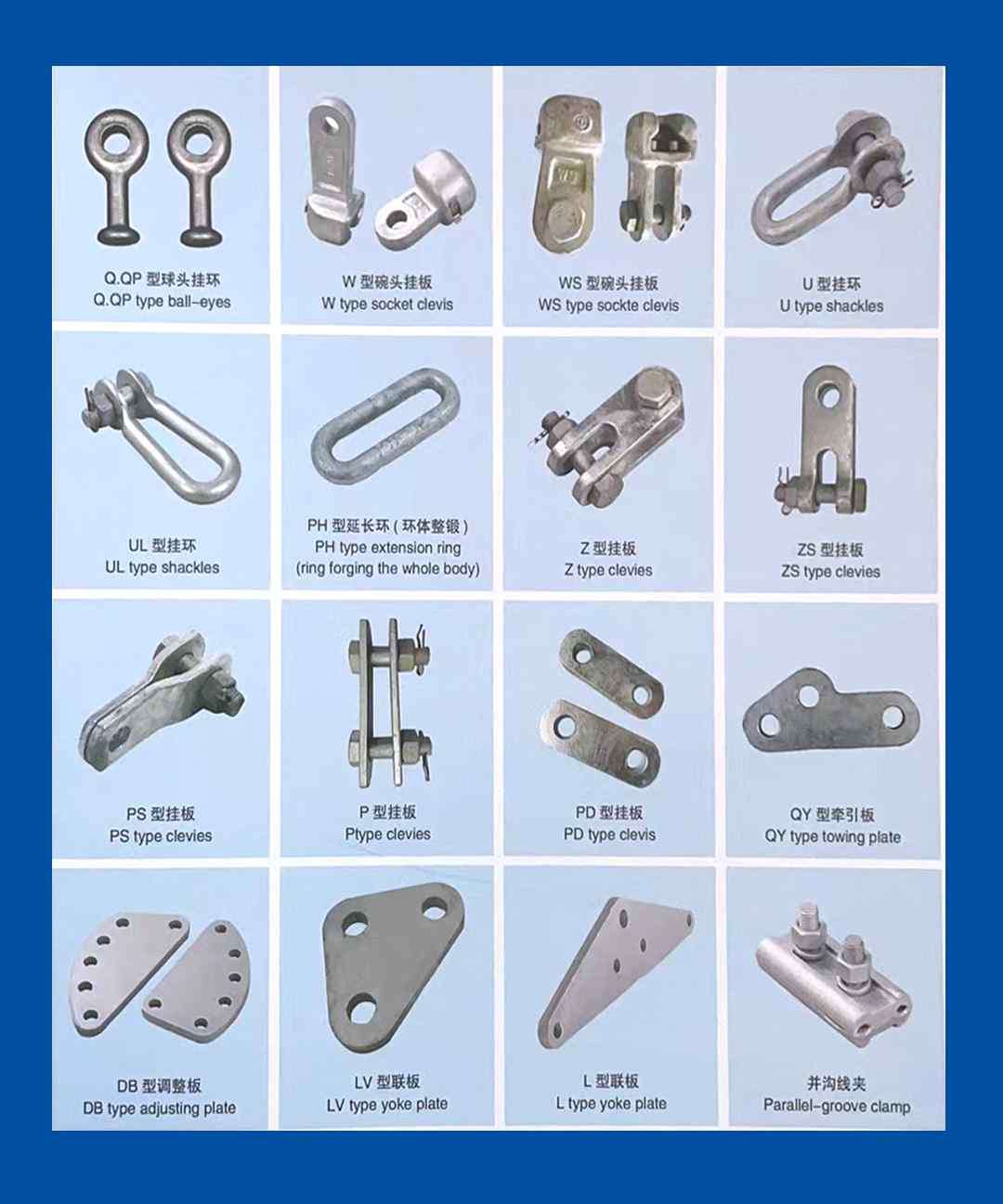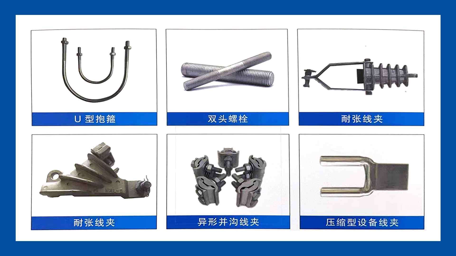 主营:扁铁抱箍、绝缘子、横担、拉线棒、联板、变压器台架、悬垂线夹、耐张线夹U型挂环、挂板、等各种电力连接金具